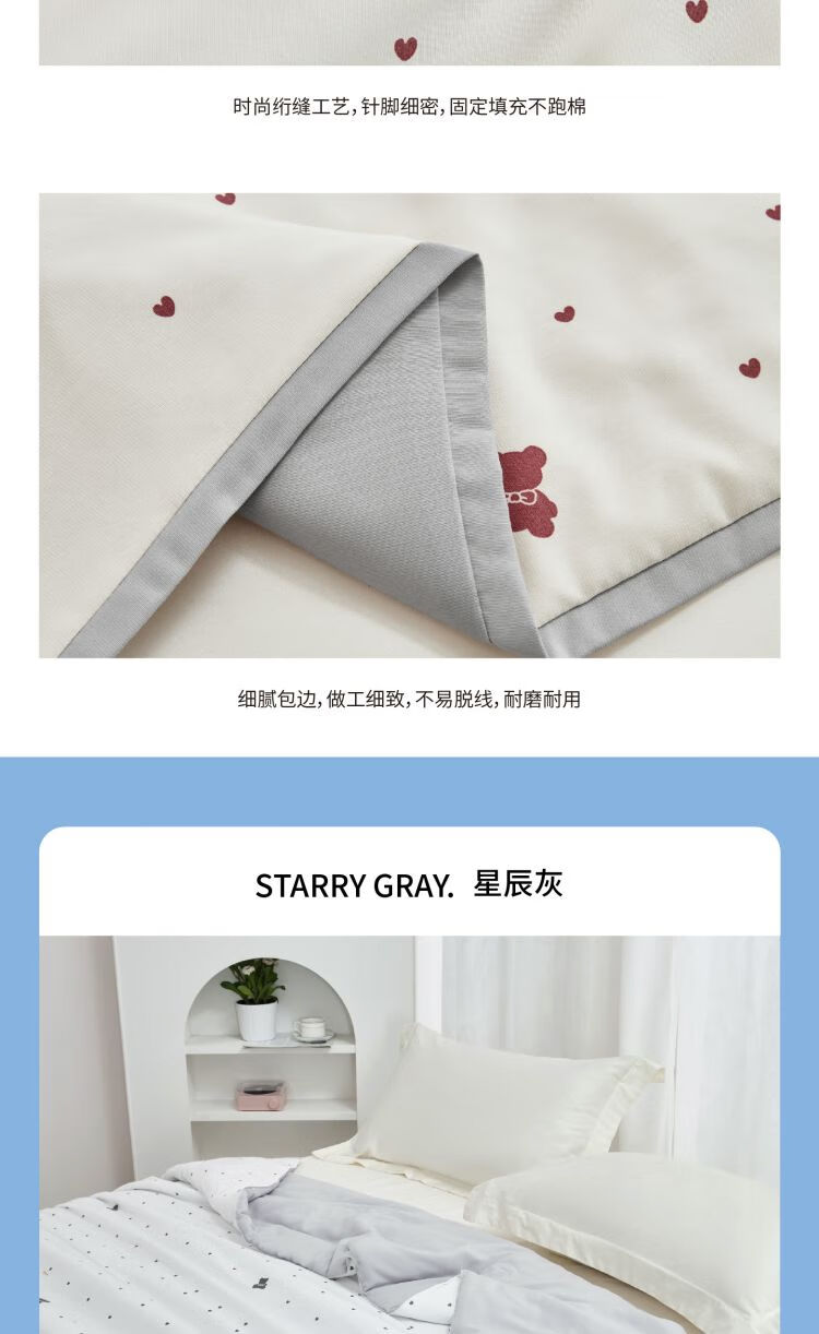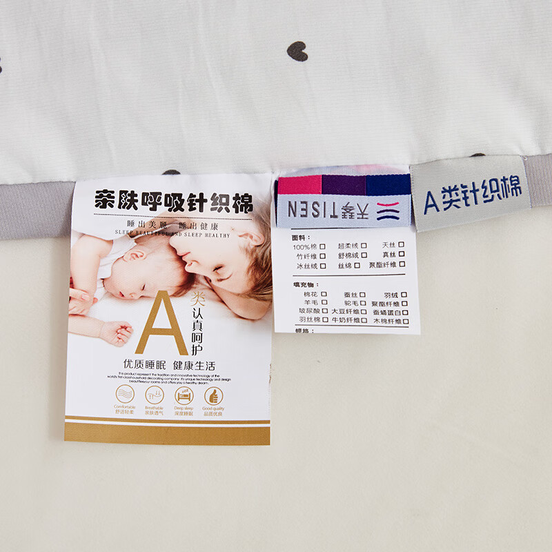 规格:200x230cm材质:针织棉(聚酯纤维) 填充物:聚酯纤维(鹅绒羽丝棉) 填充物净重:500g