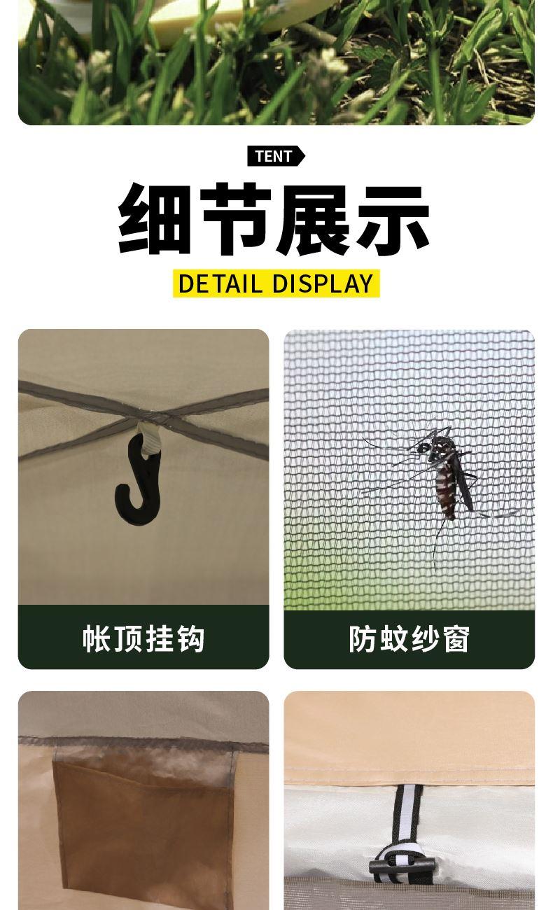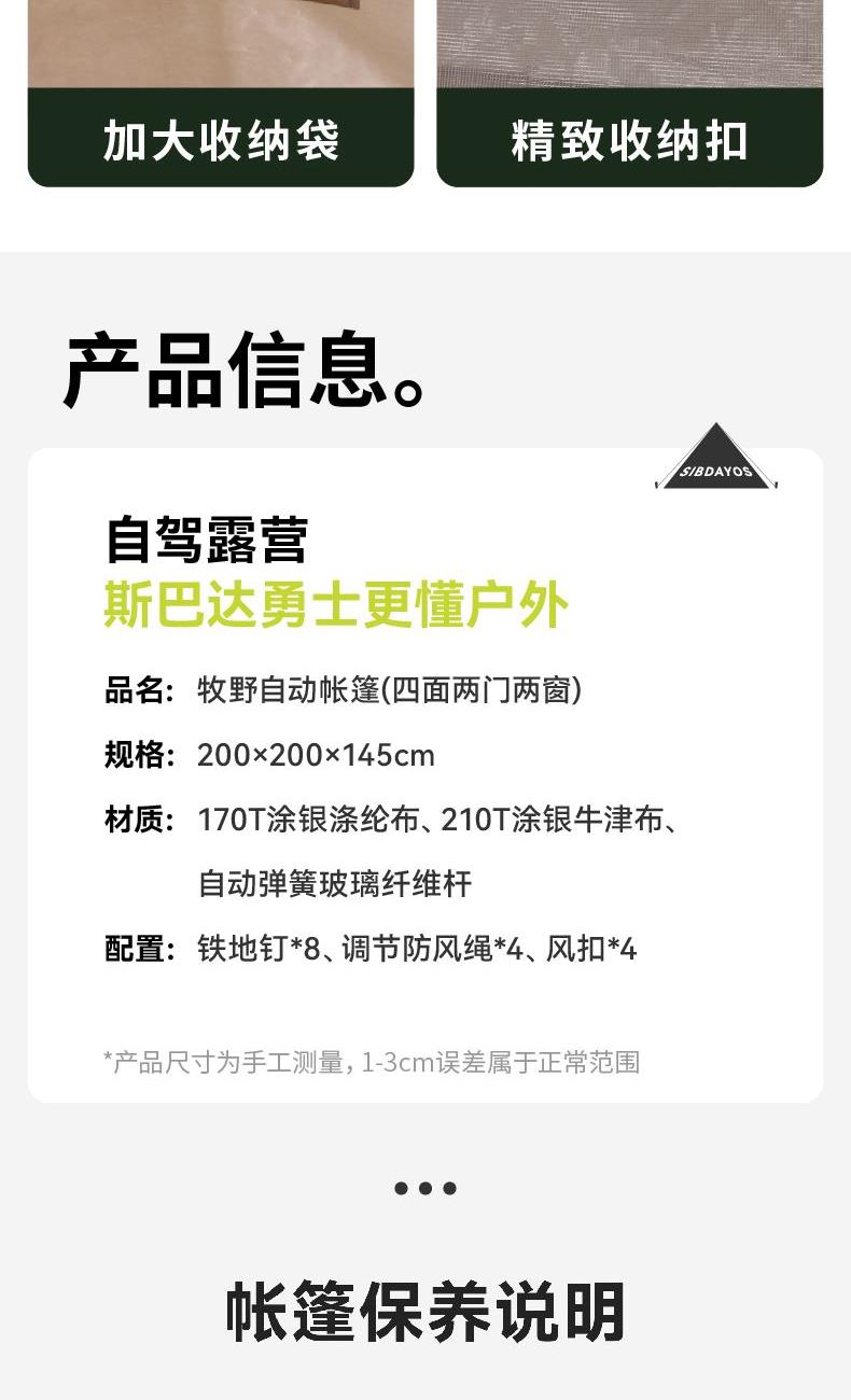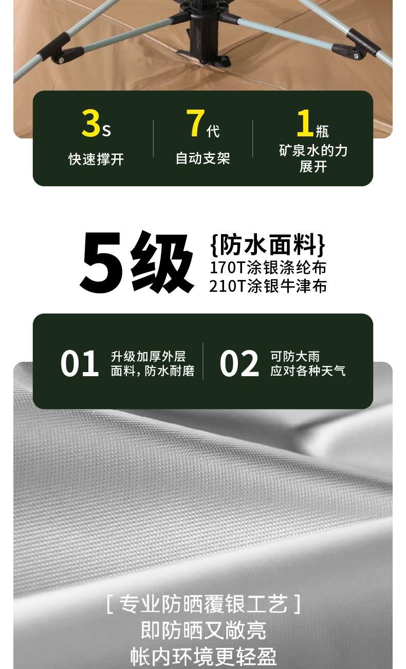 规格:200×200×145cm 材质:170T涂银涤纶布、210T涂银牛津布、自动 弹簧玻璃纤维杆 配置:铁地钉*8、调节防风绳*4、风扣*4 条形码:6978388730007