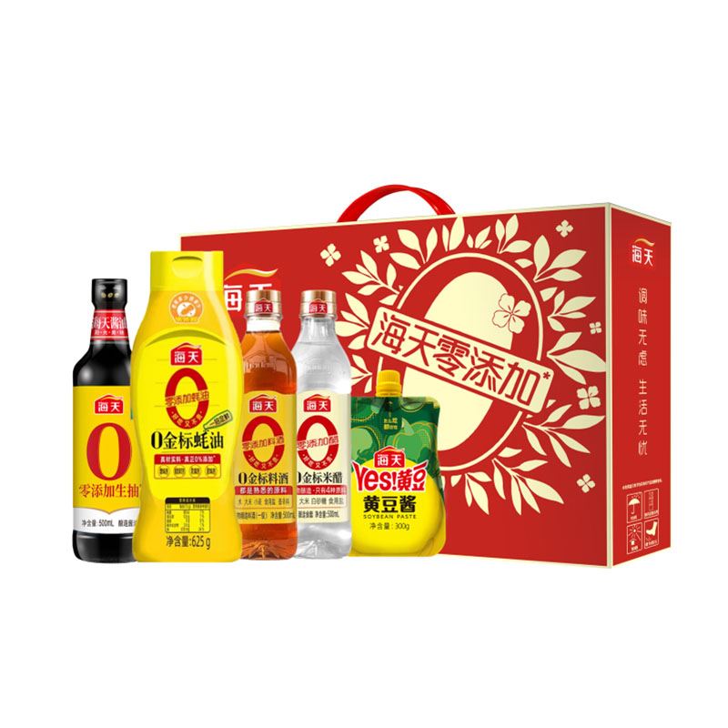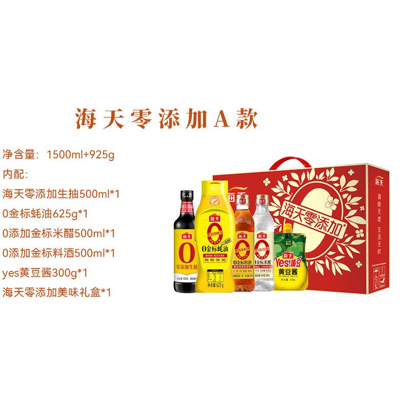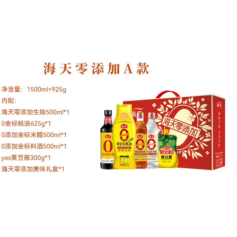 净含量:1500ml+925g内配: 海天零添加生抽500ml*1 0金 标蚝油625g*1 0添加金 标米醋500ml*1 0添加金 标料酒500ml*1 yes黄豆酱300g*1 海天零添加美味礼盒*1