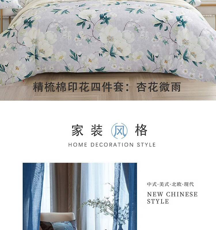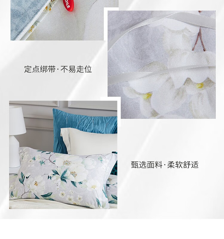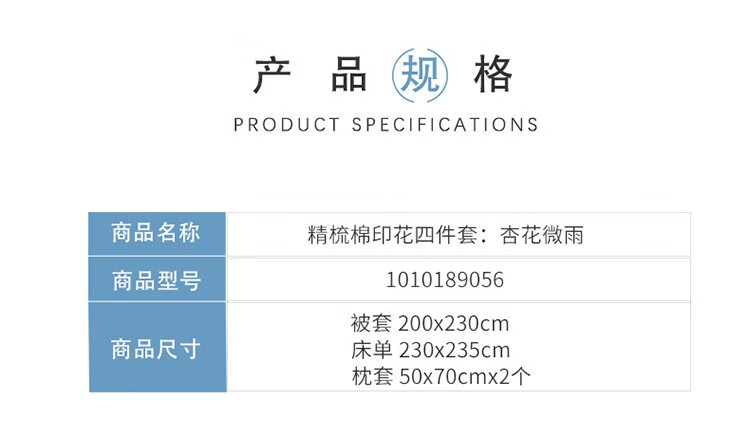 型号:1010189056 规格:被套:200*230cm 床单:230*235cm 枕套:50*70cm*2 面料: 100 %纯棉 包装:红色礼盒+手提袋 条形码:6909338182669