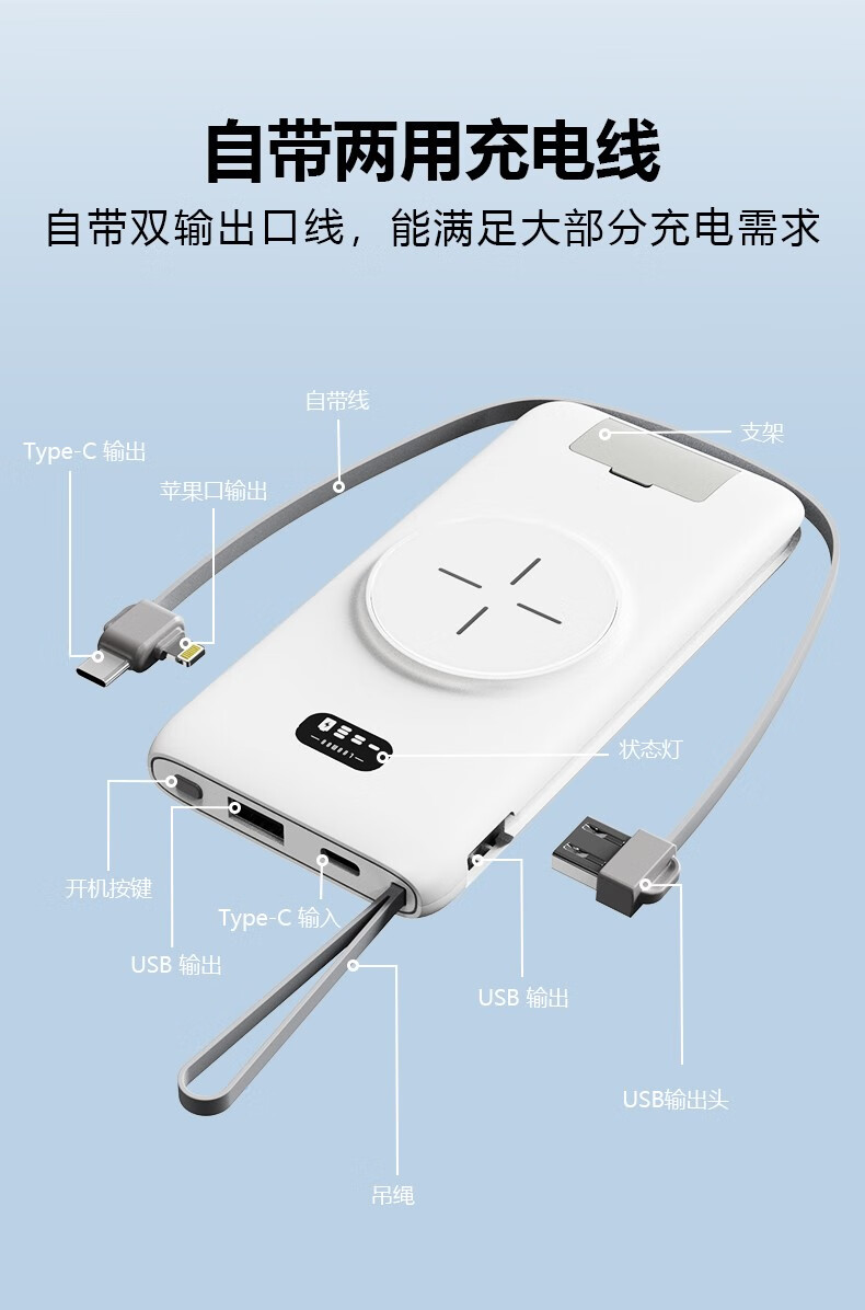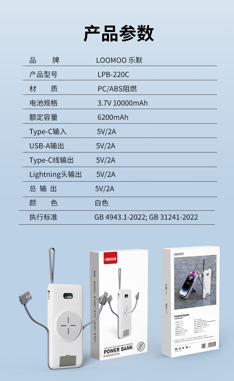 产品型号: LPB-220C 电池规格:聚合物电池3.7V 10000mAh Type-C输入:5V/2A USB输出:5V/2A 总输出:5V/2A (MAX) 额定容量:6200mAh 产品颜色:白色 寿命:循环次数≥500次 兼容性:99%手机和平板 外观材质:PC+ABS环保材质 执行标准:GB/T 35590-2017 69码:6972991656259 (有3C)