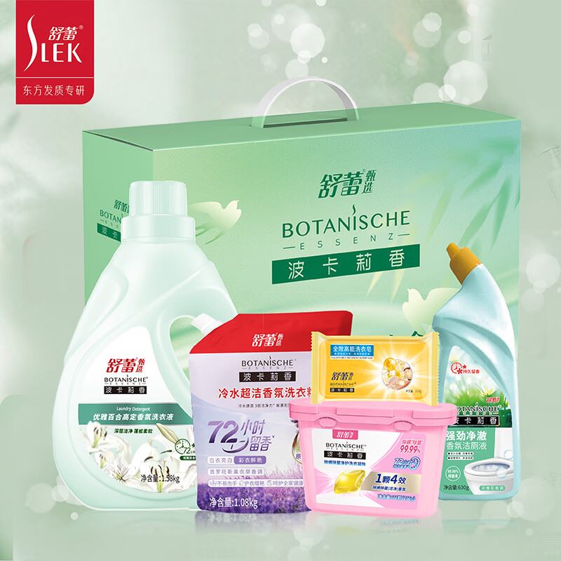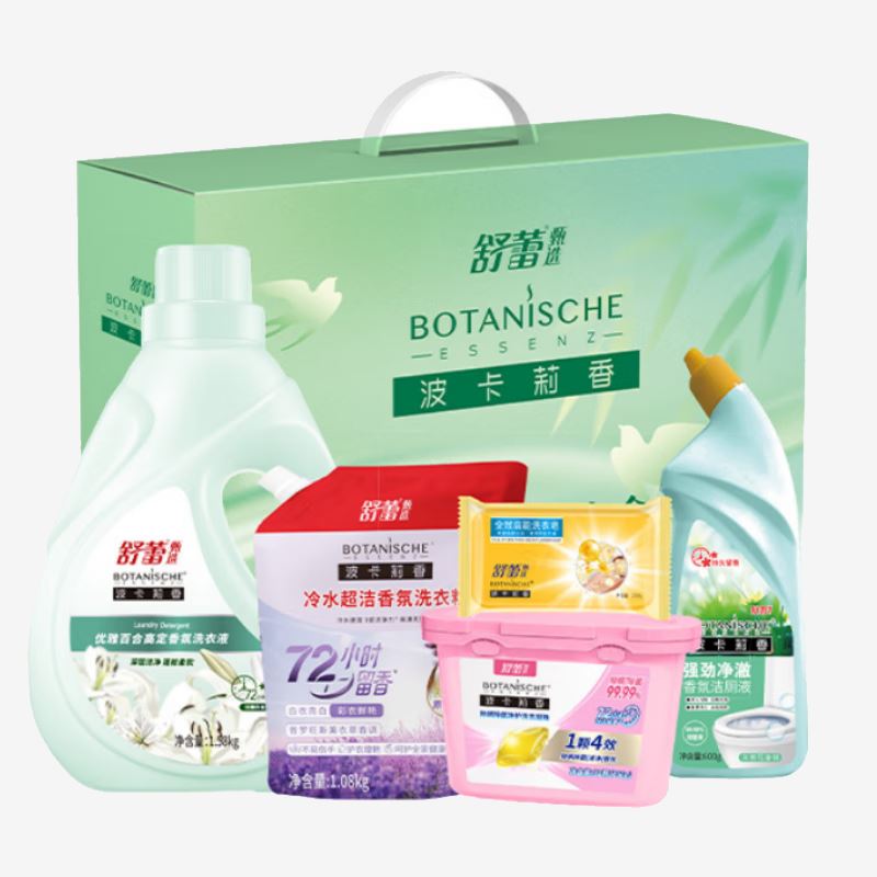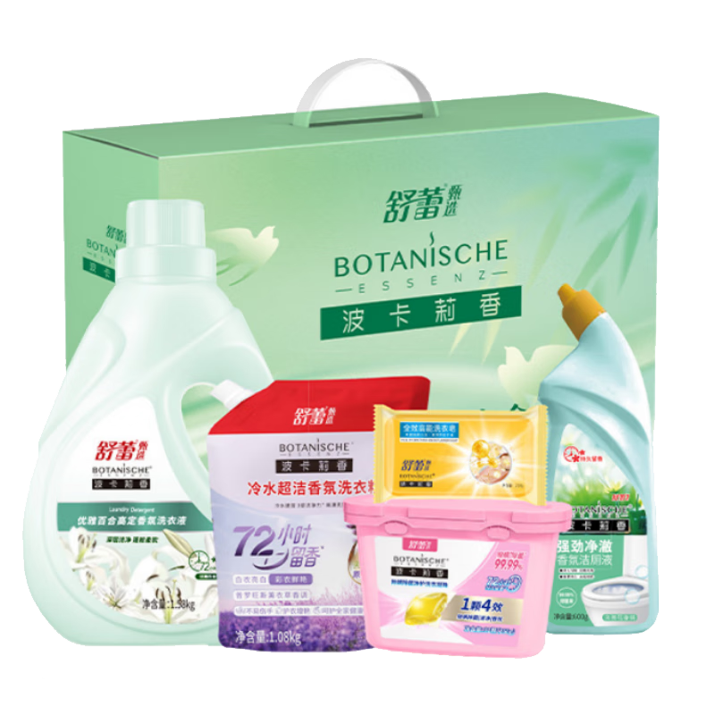 组合明细: 舒蕾甄选波卡莉香优雅百合高定香氛洗衣液-1.58kg*1 舒蕾甄选波卡莉香冷水超洁香氛洗衣粉-1.08kg*1 舒蕾甄选波卡莉香全效高能洗衣皂-210g*1 舒蕾甄选波卡莉香强劲净澈香氛洁厕液-600g*1 舒蕾甄选波卡莉香除螨除 菌净护洗衣凝珠-256g(32颗)*1 礼盒
