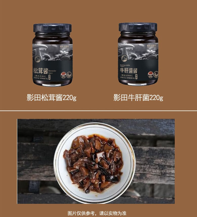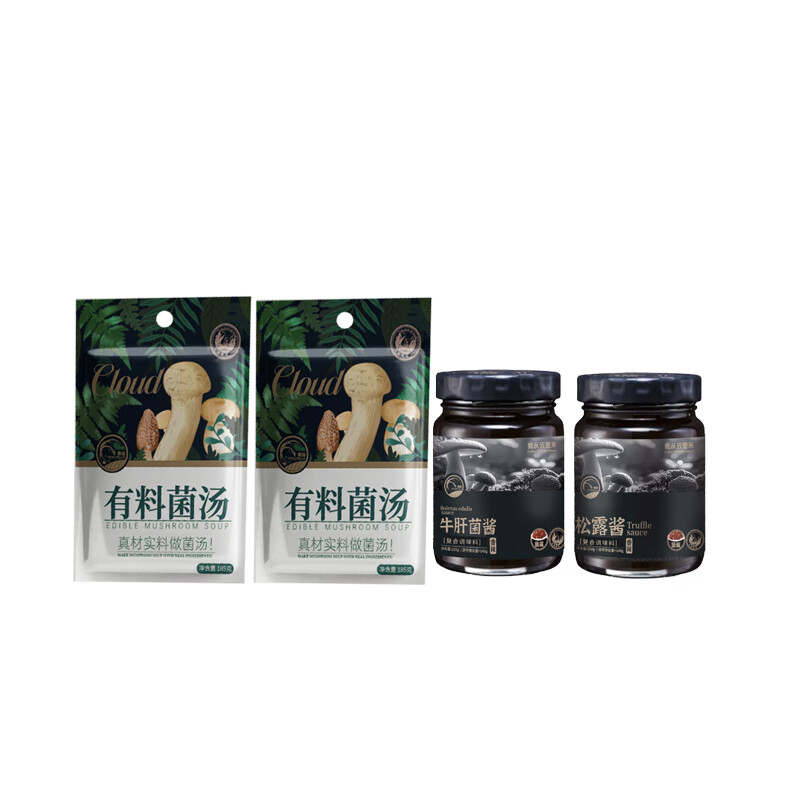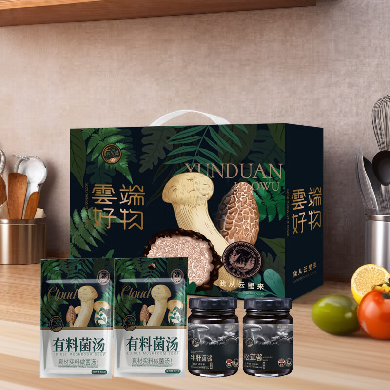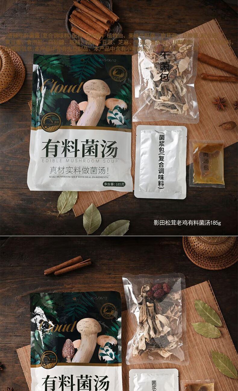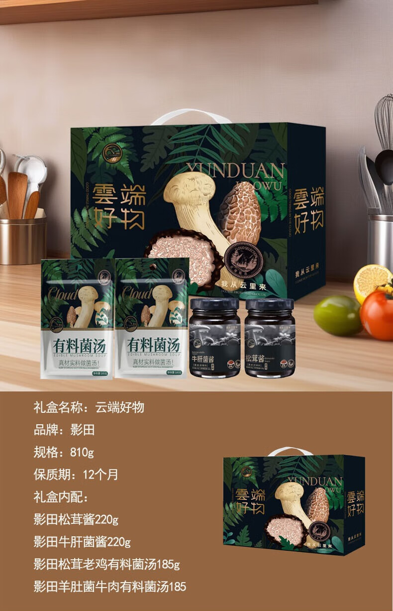 礼盒内配: 影田松茸酱220g 影田牛肝菌酱220g 影田松茸老鸡有料菌汤185g(干菌包+菌浆包+肉汤包) 影田羊肚菌牛肉有料菌汤185g(干菌包+菌浆包+肉汤包)