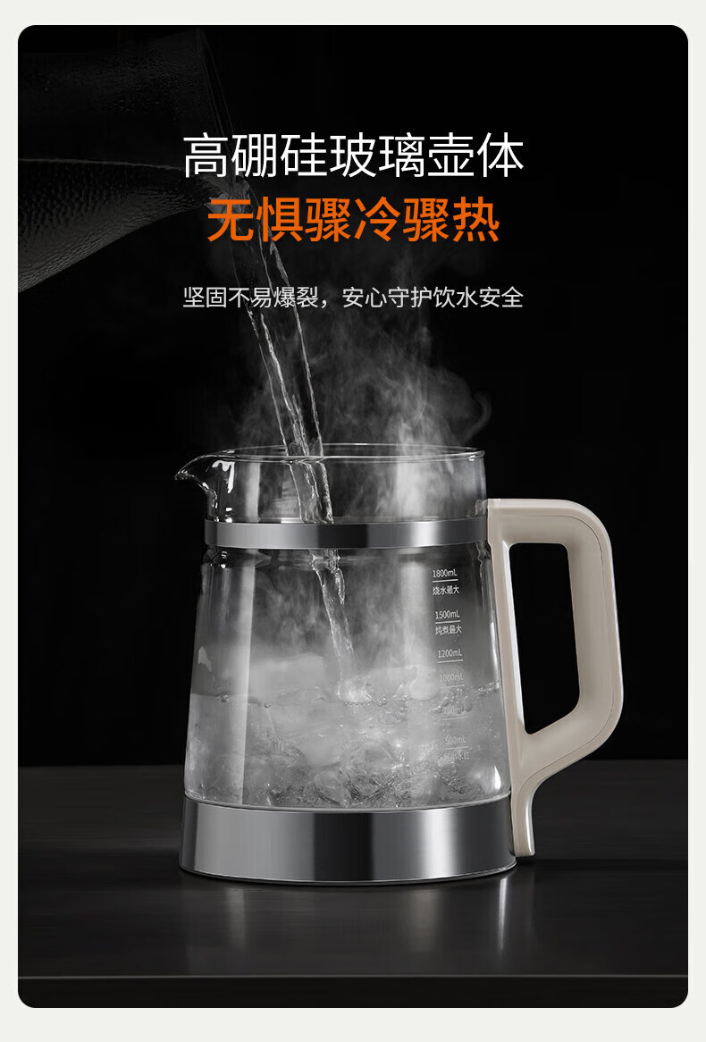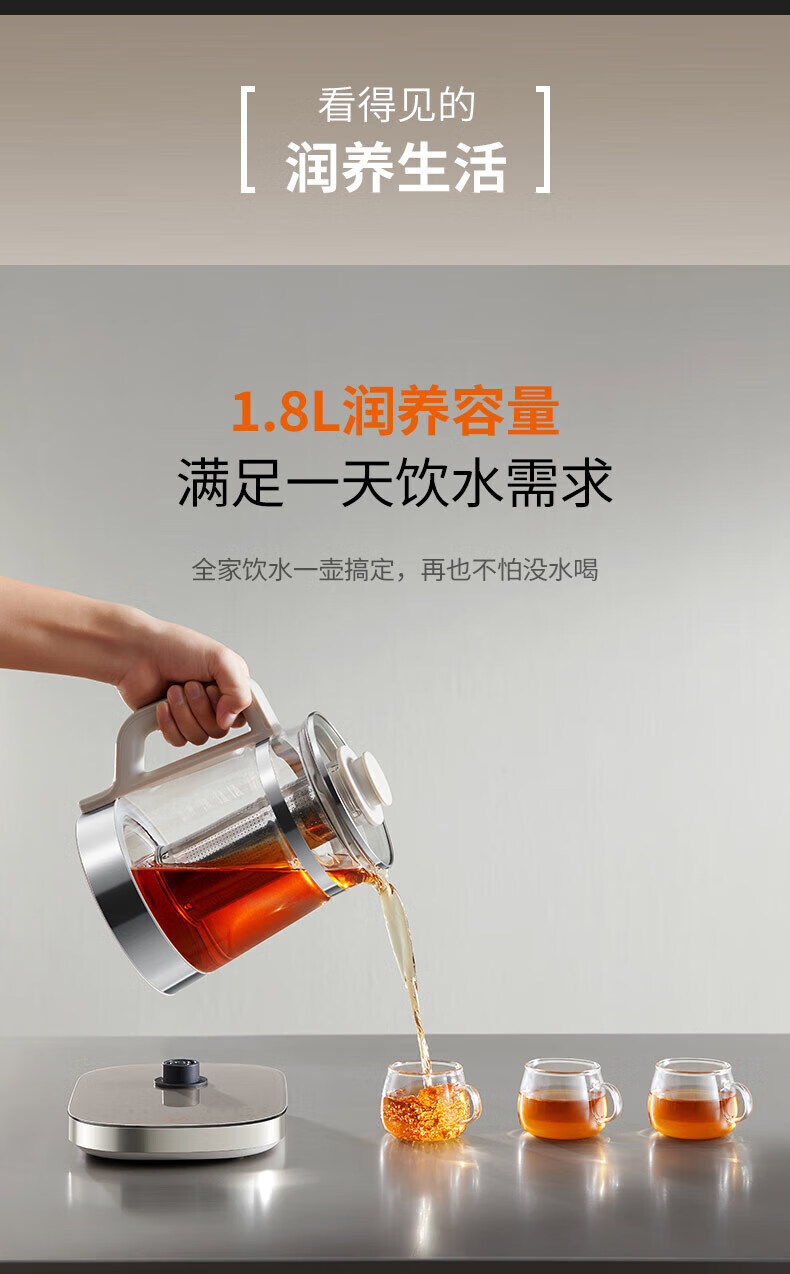 1、高 级外观质感,1.8L大容量, 2、316L不锈钢加热盘 3、316L不锈钢可拆小茶篮 4、双钢精铸造,轻颜润养生活 装 箱:6台 /箱