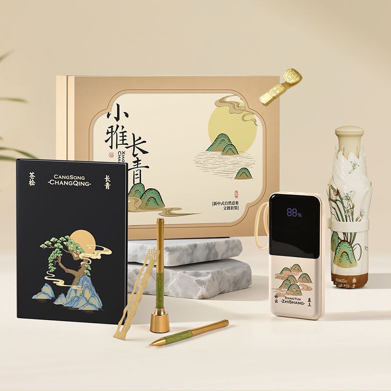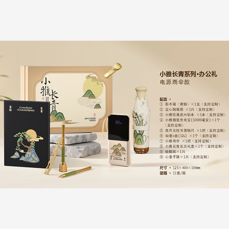 配置 · ① 影木笔(黄铜)×1支(支持定制) ② 定心铜笔插 ×1只(支持定制) ③ 小雅仿真皮PU软本 ×1本(支持定制) ④ 小雅数显充电宝(10000毫安)×1个 (支持定制) ⑤ 高升文创书签铜尺 ×1把(支持定制) ⑥ 如意U盘(32G) ×1个(支持定制) ⑦ 小雅雨伞 ×1把(支持定制) ⑧ 小雅长青长方礼盒×1个(支持定制) ⑨ 硫酸纸×1只 ⑩ 心意手袋×1只(支持定制) 尺寸 · 125×400×100mm 装 箱 · 11套 /箱