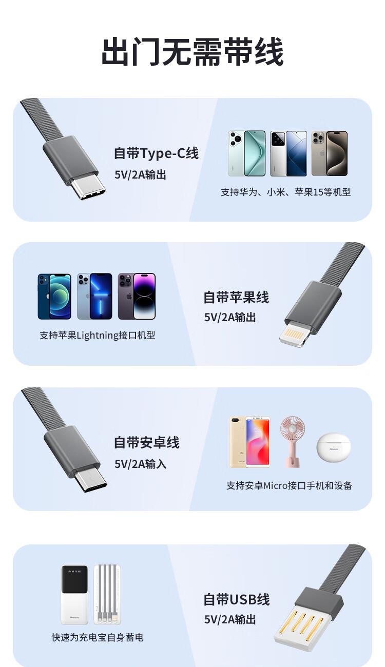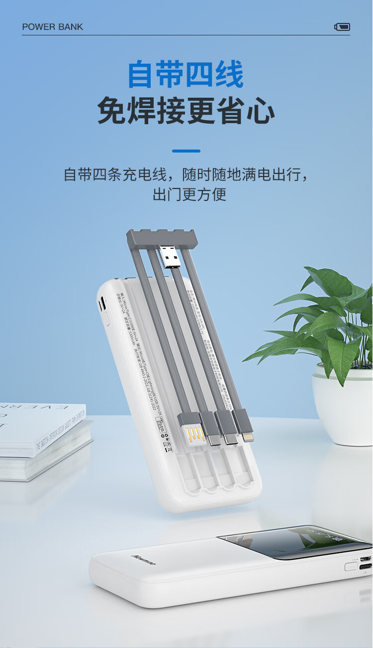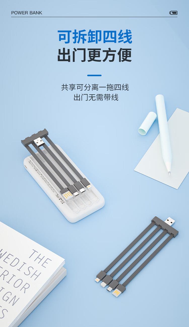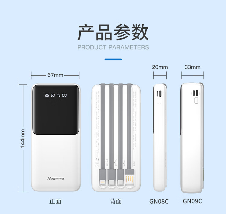 2万毫安基础款充电宝 自带4线(可拆解) 聚合物电池 输入:Micro口/Type-c口/USB线:5V/2A 输出:Type-c线/Lightning线/Type-c线/USB口:5V/2A GN09C 电池容量:20000mAh GN09C 额定:10600mAh GN09C尺寸:144*67*33mm 产品重量:428g