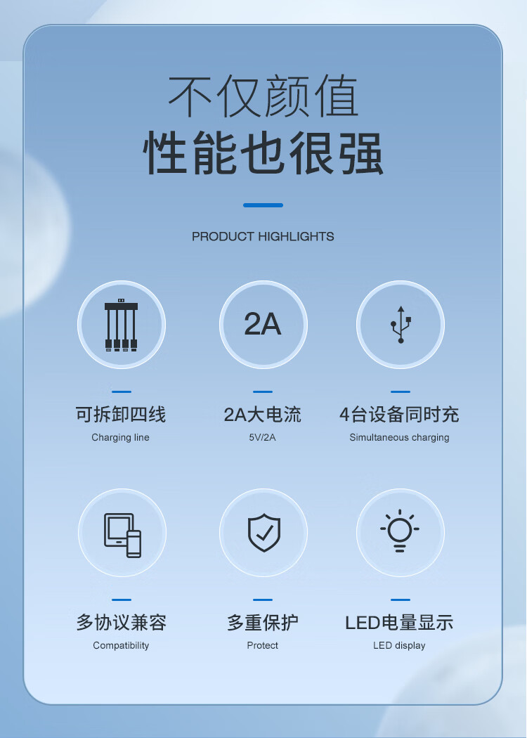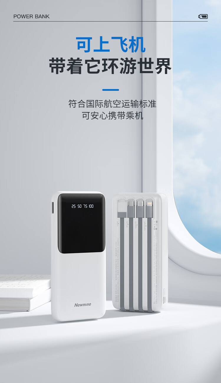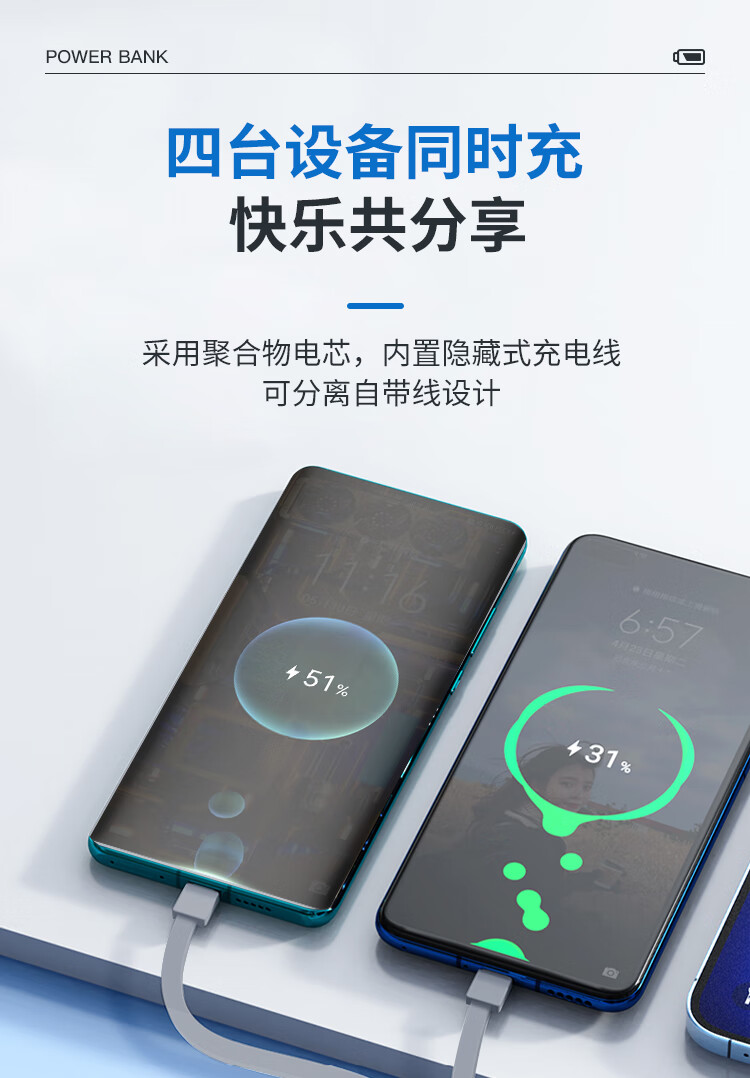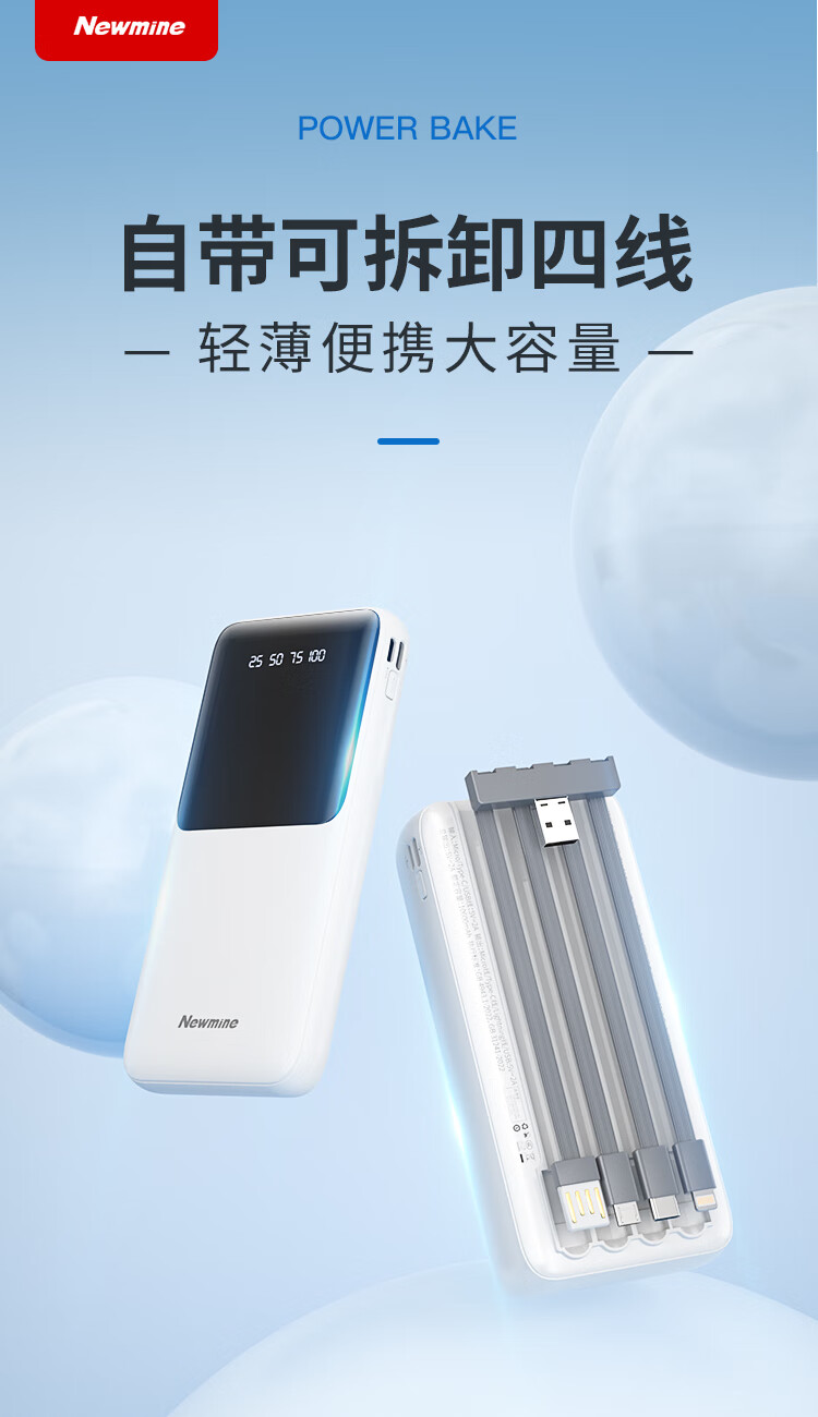 2万毫安基础款充电宝 自带4线(可拆解) 聚合物电池 输入:Micro口/Type-c口/USB线:5V/2A 输出:Type-c线/Lightning线/Type-c线/USB口:5V/2A GN09C 电池容量:20000mAh GN09C 额定:10600mAh GN09C尺寸:144*67*33mm 产品重量:428g
