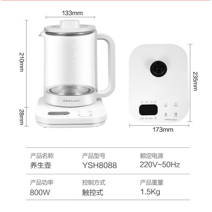 产品型号:YSH8088 额定电压:220V~ 额定功率:800W 产品容量:1.8L 产品材质:高硼硅玻璃、304#不锈钢、PP 商品条码:6941220234933