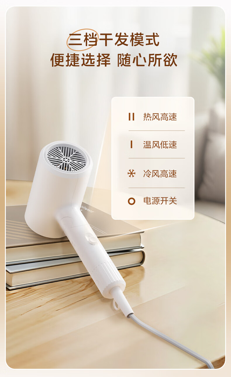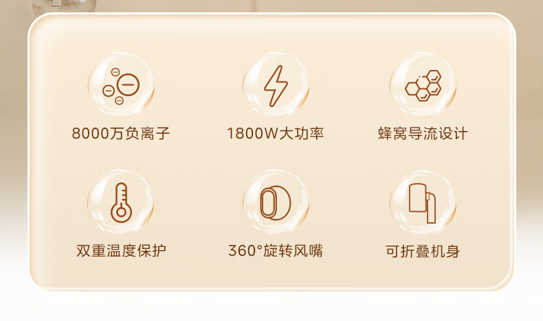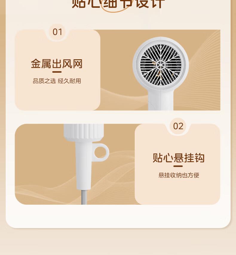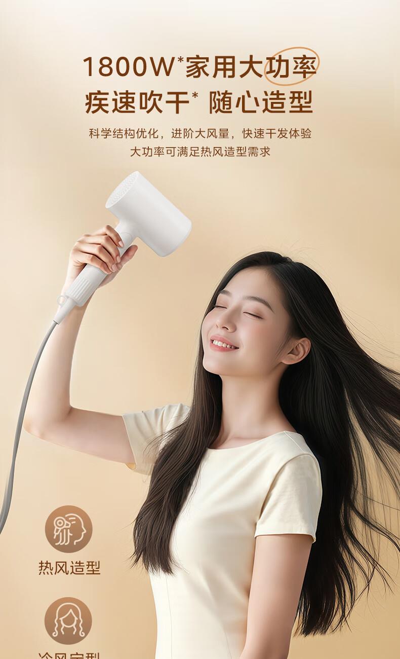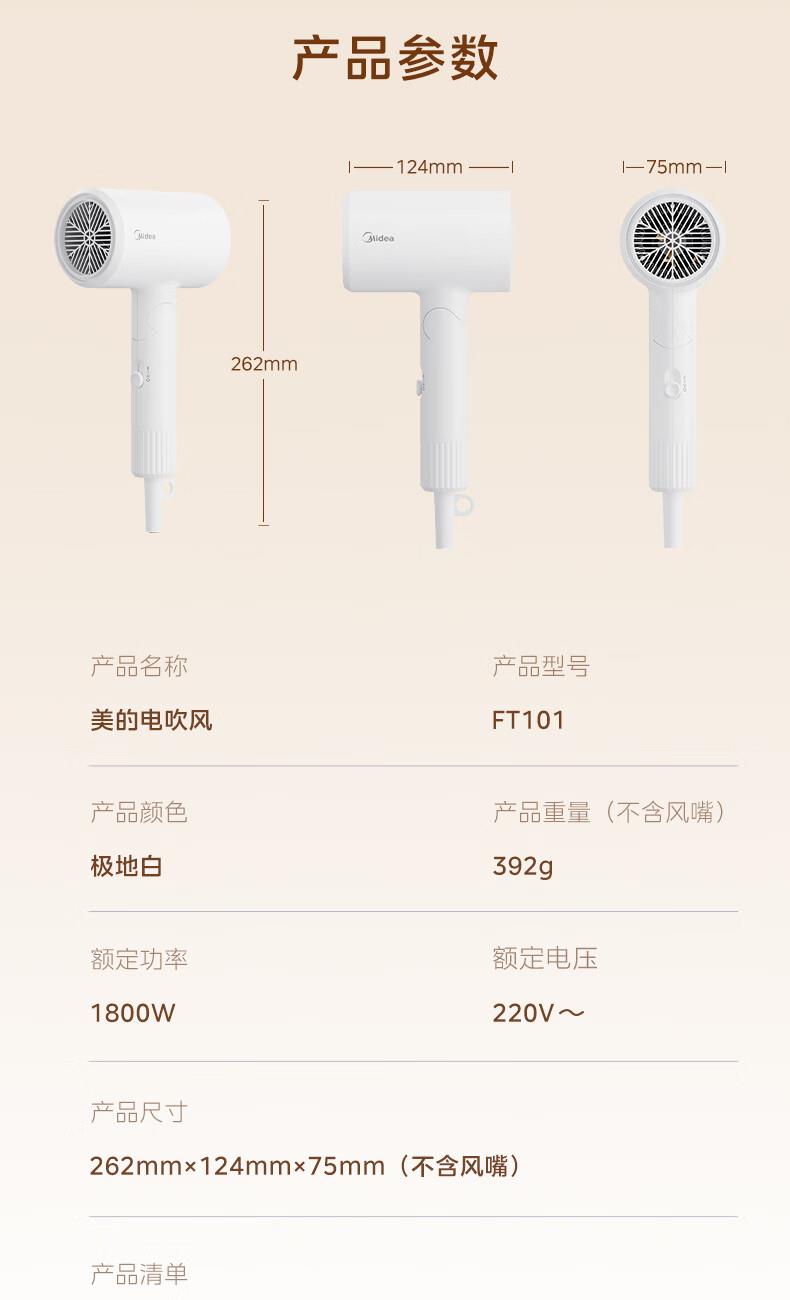 额定功率 : 1800w 额定输入 : 220V~50Hz 包装内含 : 主机*1、风嘴*1、说明书*1 ① 定制1800w大功率,3分钟快速干发; ② 温和大风力,速干不伤发 ③释放高浓度2万级水润负离子,双重温控智能恒温 ④ 两档风速+独立冷热风;进风网人性化设计,防吸发