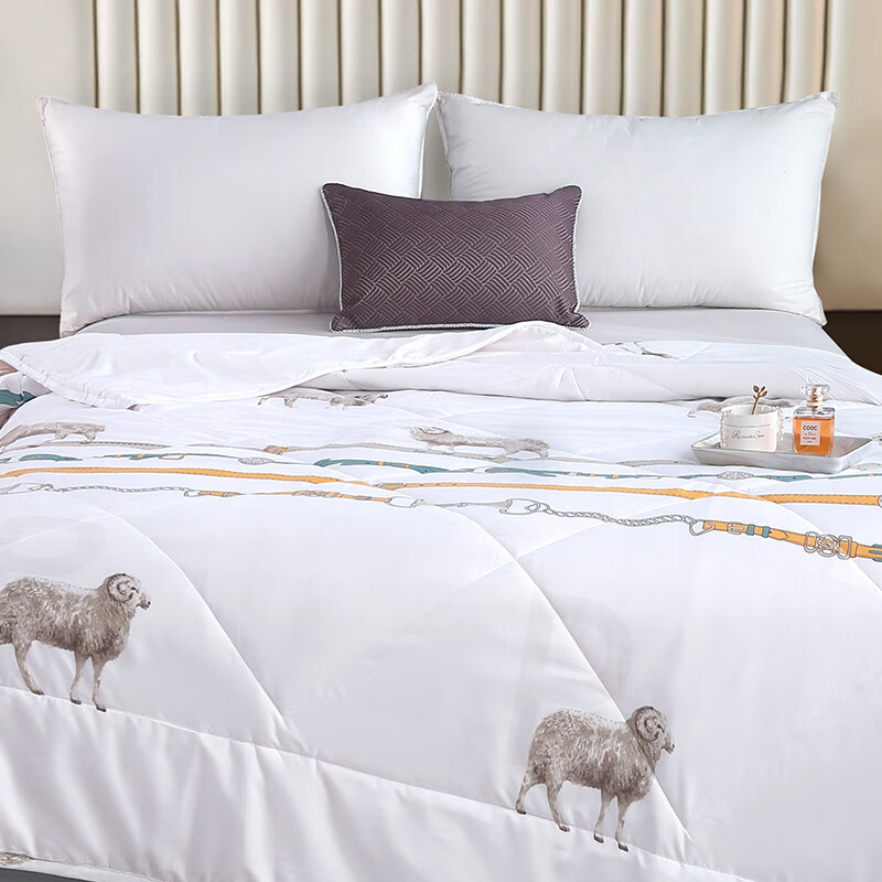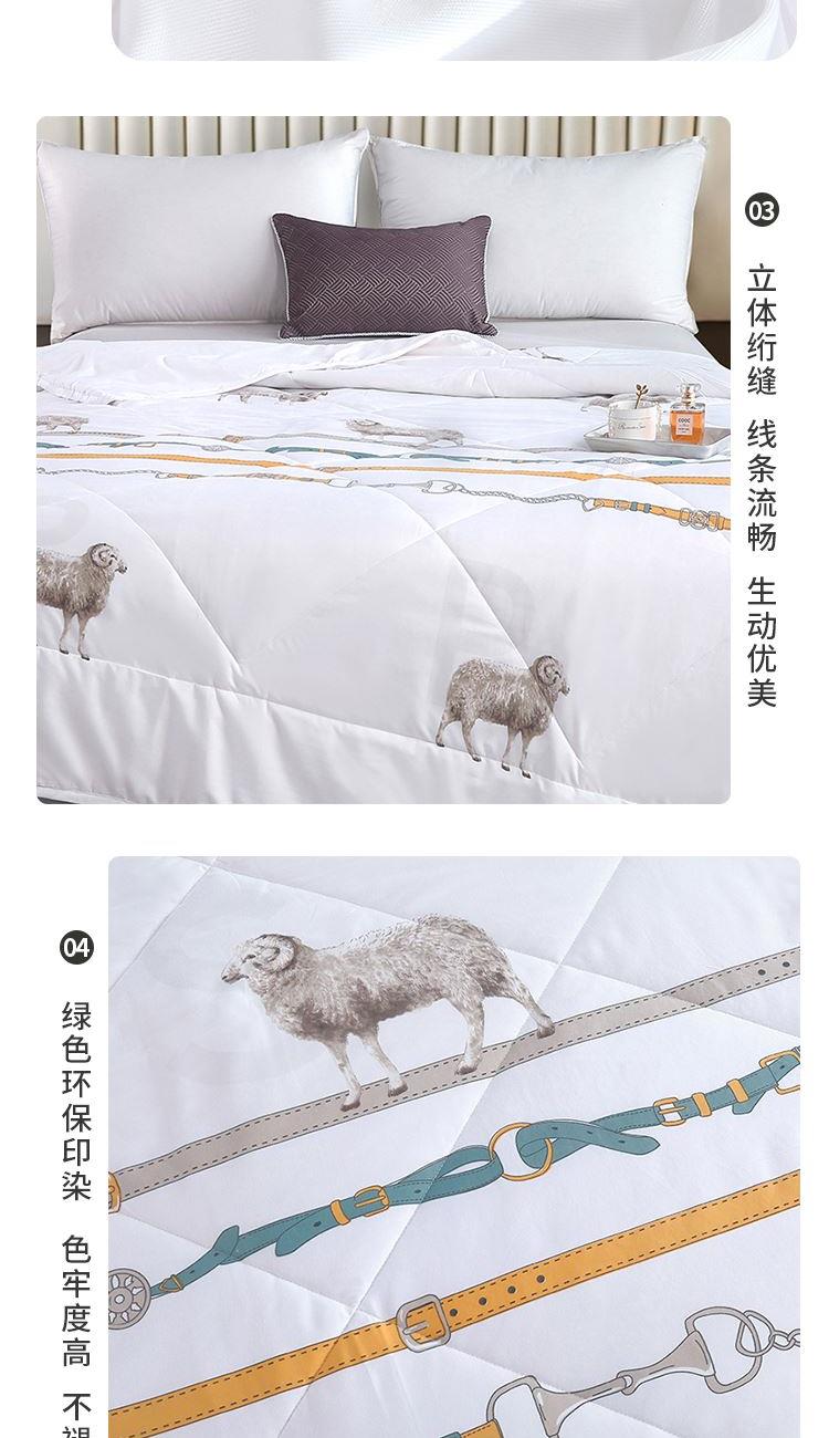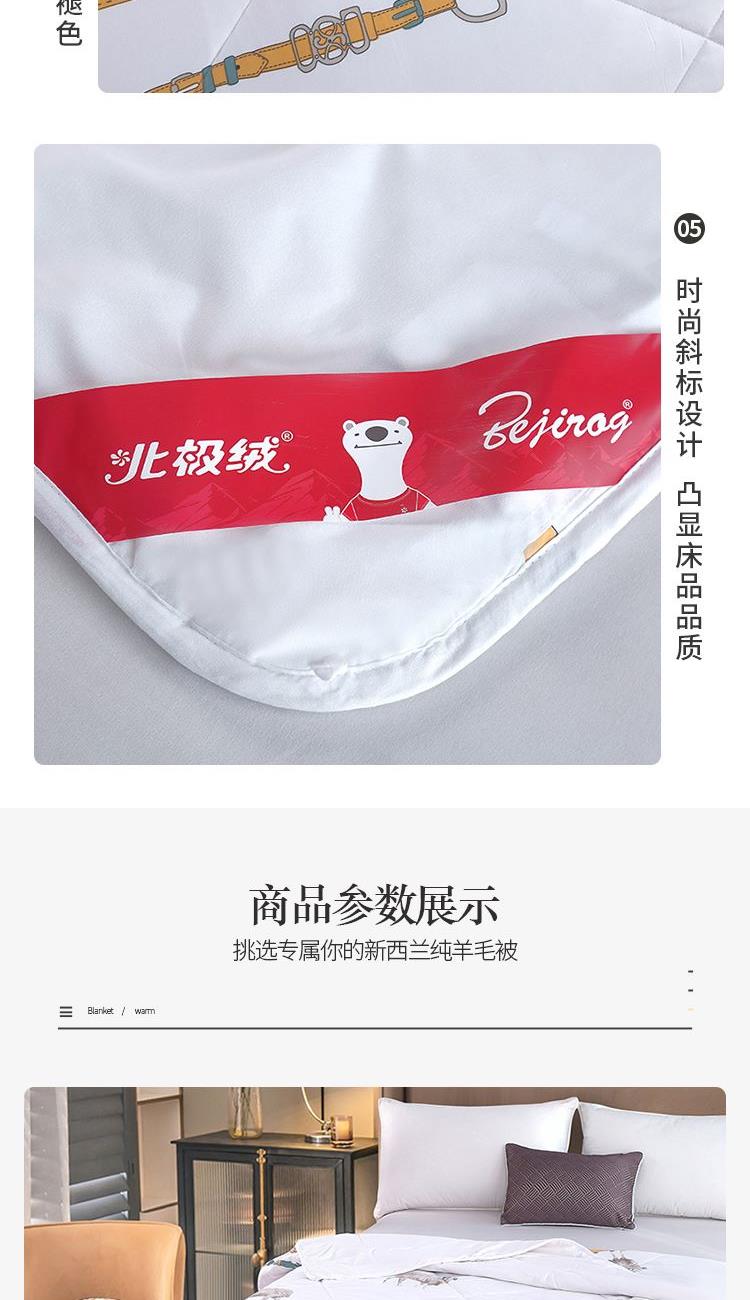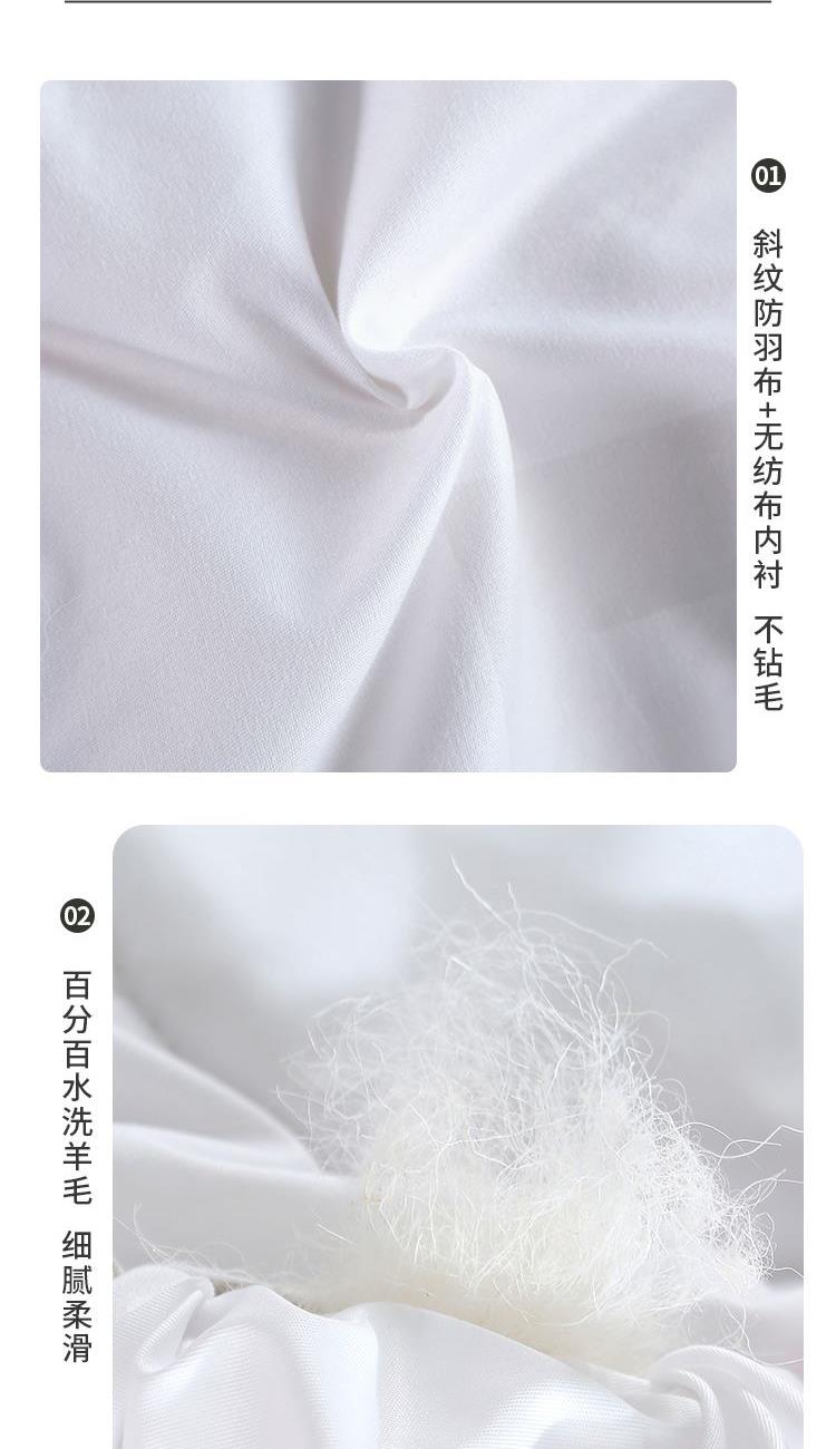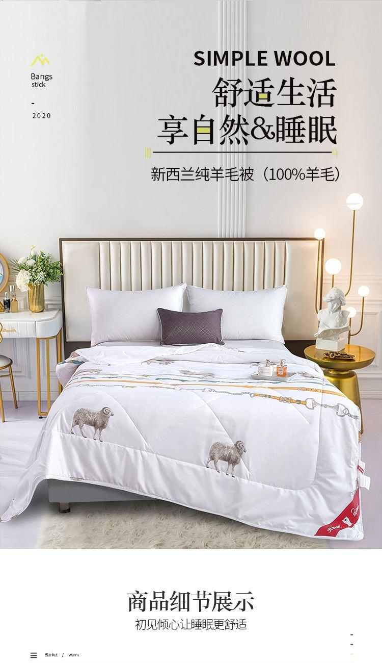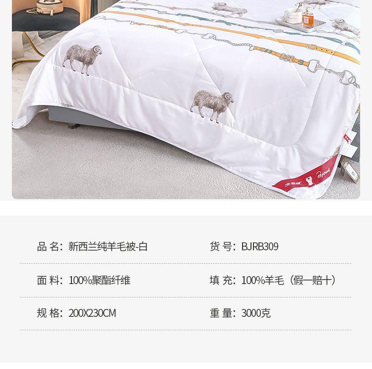货 号:BJRB309 面 料:100 %聚酯纤维 填 充:100 %羊毛(假一赔十) 规 格:200x230cm 重 量:3000克 包 装:高 档皮革软包/礼盒 打包 数:30条 / 包