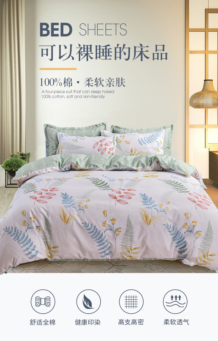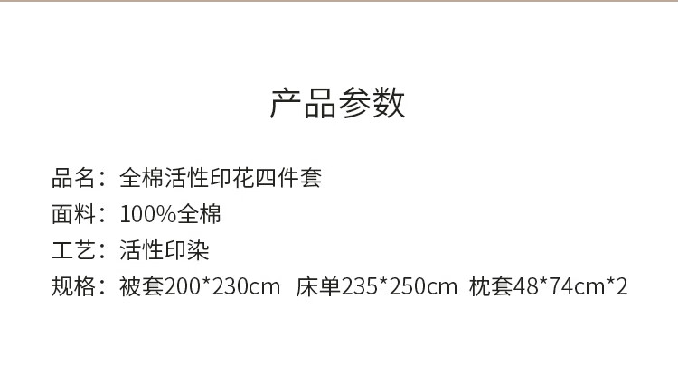 面 料:100 %棉 规 格:被套200*230cm 床单230*250cm 枕套48*74cm*2 包 装:天地盖/手提盒