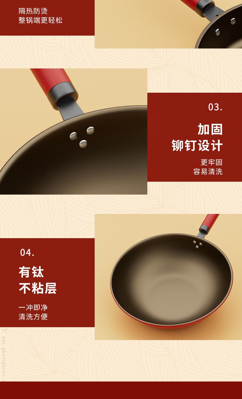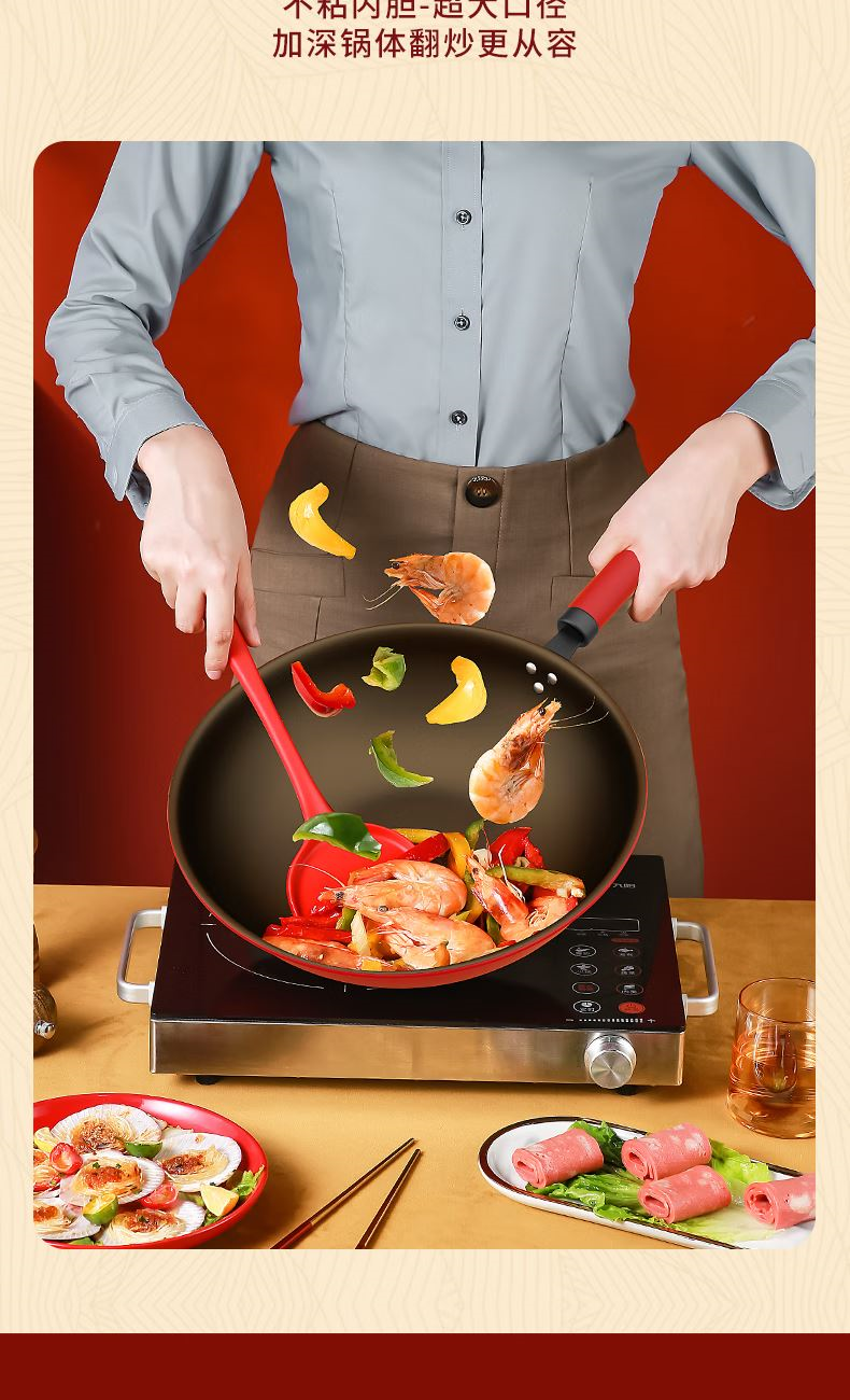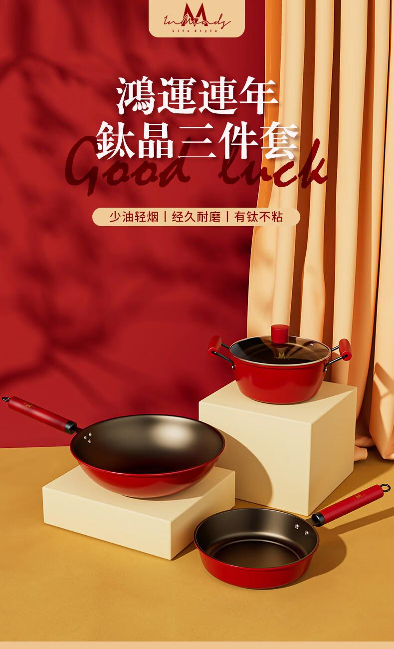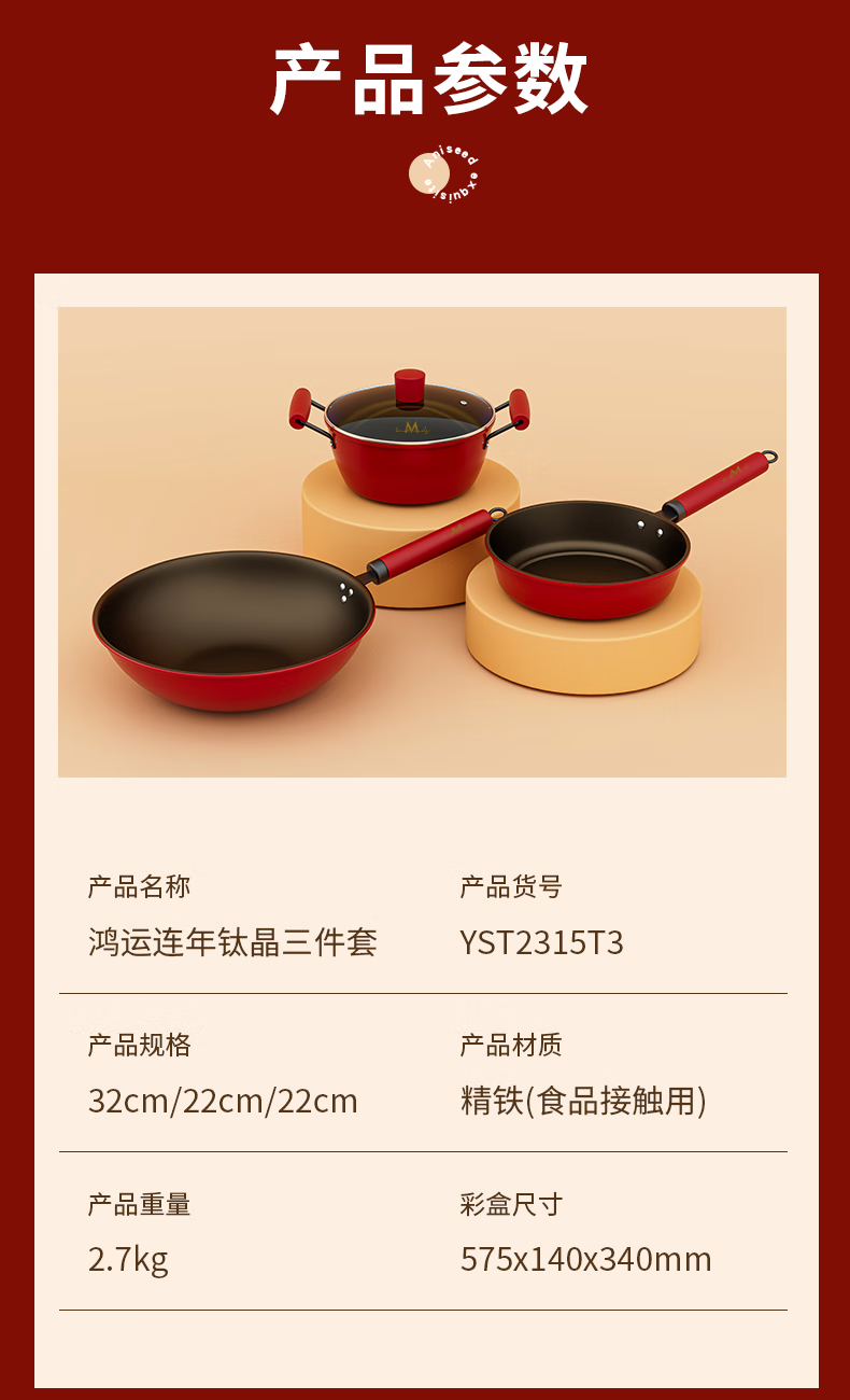 鸿运连年钛晶三件套 炒锅32cm+汤锅22cm+煎锅22cm 精铁(食品接触用) 2.7Kg 5/kg 钢化玻璃盖 555x140x380mm单个6kg 72.5X57X39.5cm(5套)