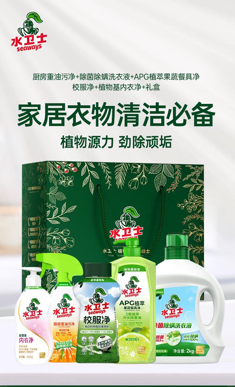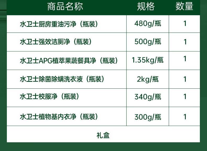 (1)水卫士油污净-带喷头480g*1 (5)水卫士校服净340g*1 (2)水卫士强效洁厕净500g*1 (6)水卫士除 菌除 螨洗衣液2kg*1 (3)水卫士金桔洗洁精1.35kg*1 (4)水卫士内衣洗衣液300g*1