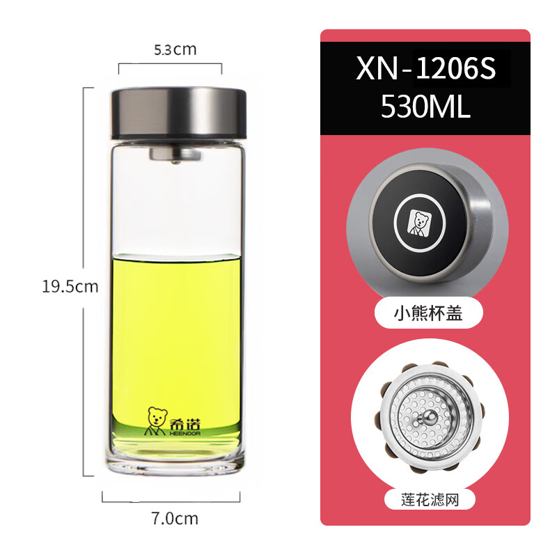 容量 XN-1206S:530ml 规格(mm) XN-1206S:53(杯口直径)x71(直径)x197(高度) 杯体 单层高硼硅玻璃 杯盖 进口食品级PP、304不锈钢 滤网 304不锈钢、进口食品级硅胶 密封圈 进口食品级硅胶 重量 XN-1206S:0.44kg 颜色 本色