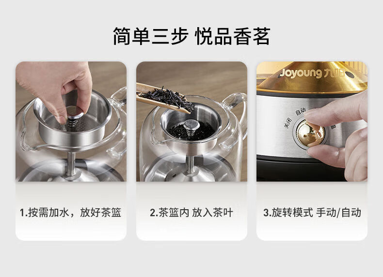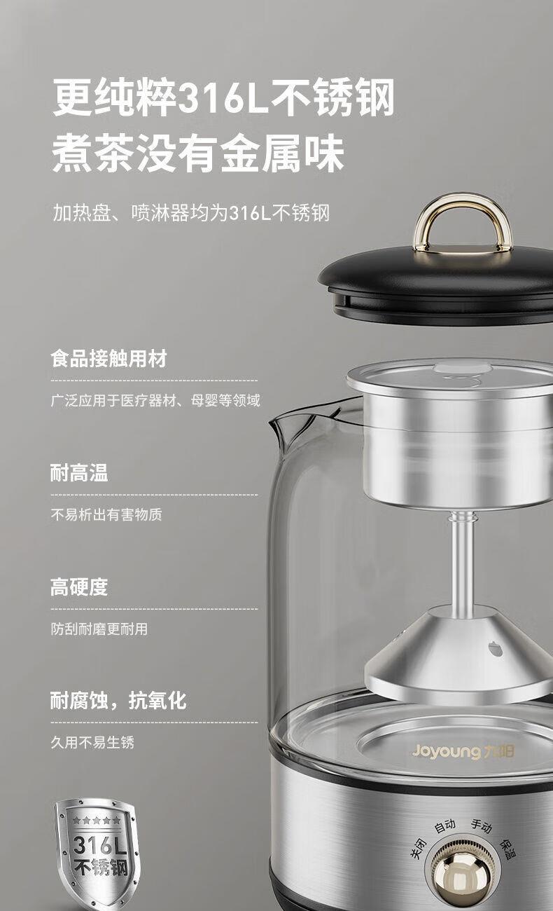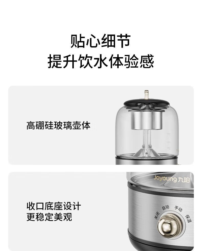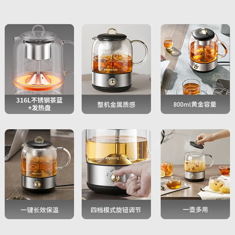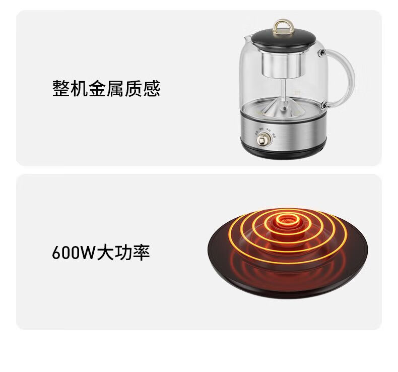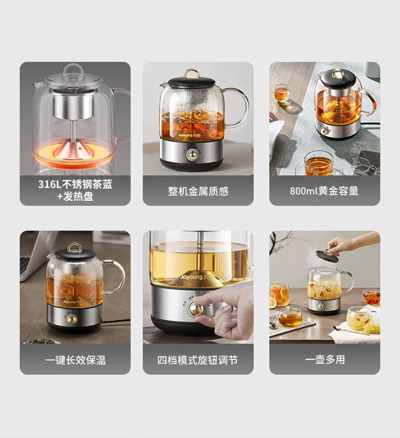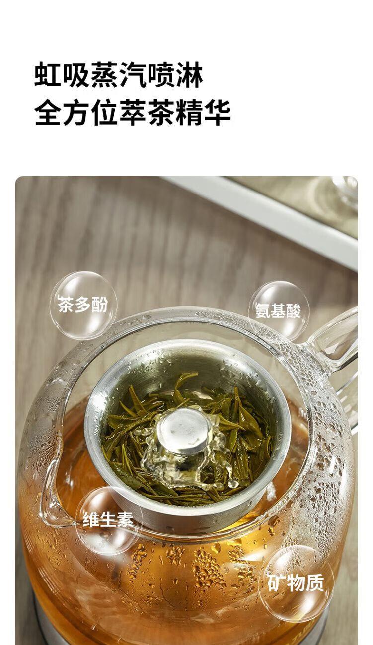 1、喷淋式蒸茶:充分释放茶香,还原茶本味; 2、316L加热盘和茶蓝,更放心耐用,不易生锈; 3、茶水分离设计,不久泡不涩口; 4、极简可爱造型,完 美适配办公位; 5、4档位控制,长效保温; 6、润养不止煮茶,花茶煲汤不在话下; 7、高硼硅玻璃,冷热两不惧; 8、超绝温控,精 准控温+安全防干烧;