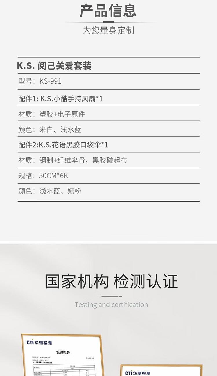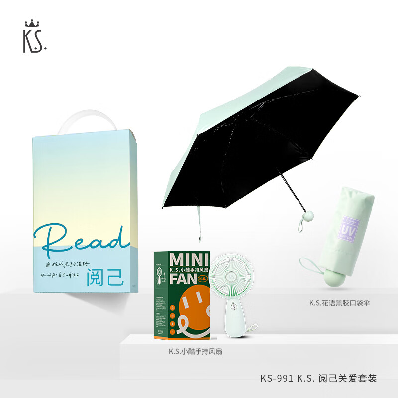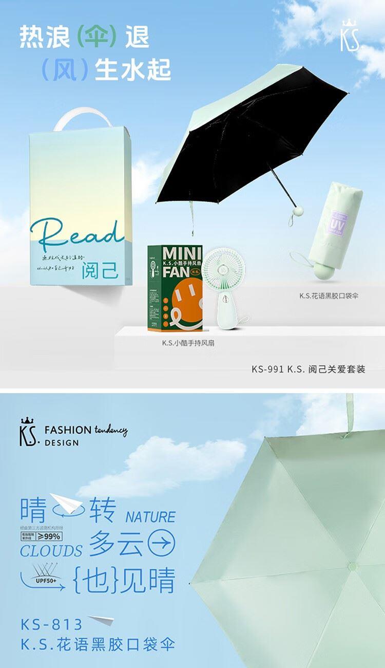 礼盒配置 1.K.S.见棠黑胶五折伞 *1 2.K.S.小酷手持风扇 *1 3.手提礼盒*1 包装:彩盒装 装 箱数:48套 /箱