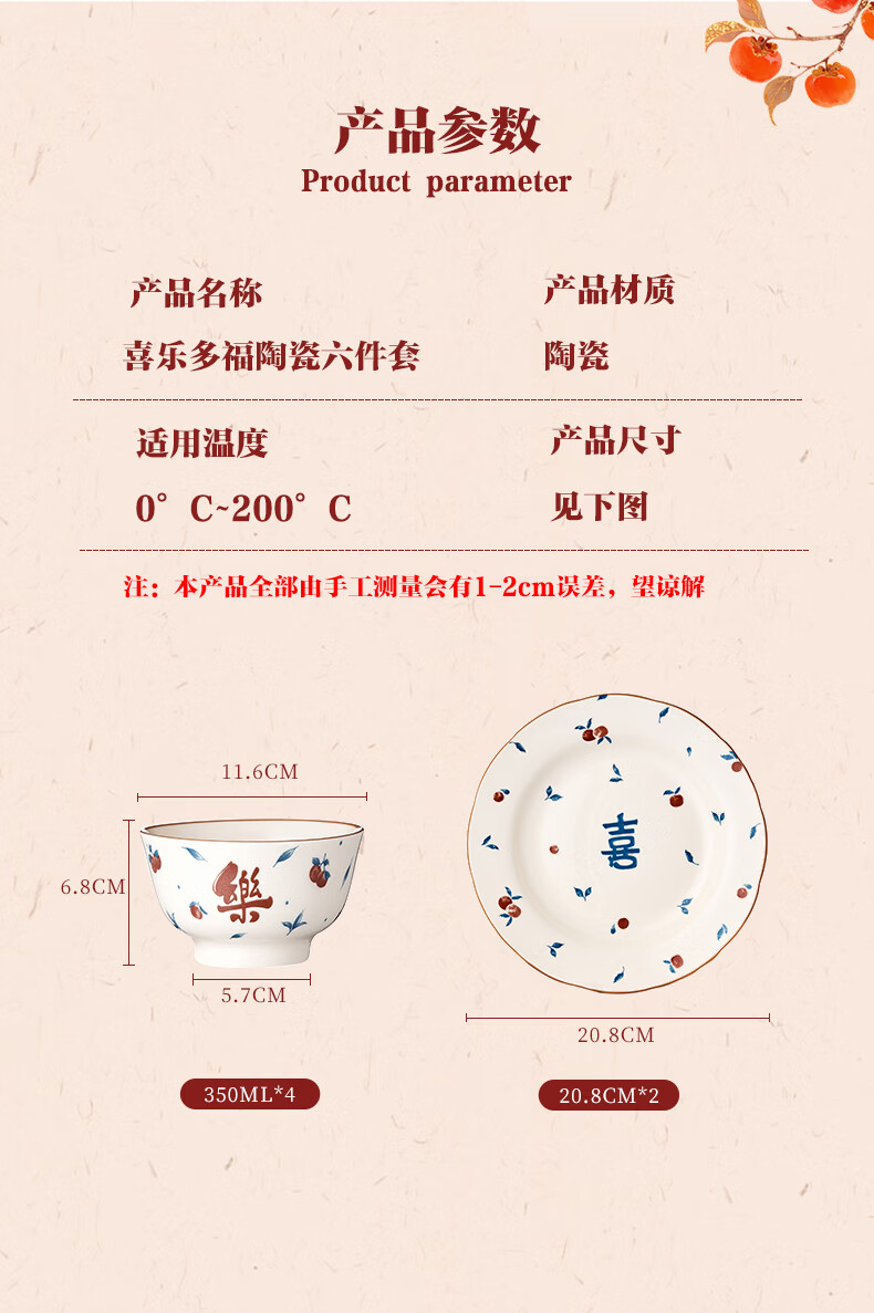 材 质:陶瓷装 箱 规格:8套 /箱产品参数:小碗*4、盘子*2彩盒尺寸:469*76*234mm 外箱尺寸:48.3*32.4*48.6cm